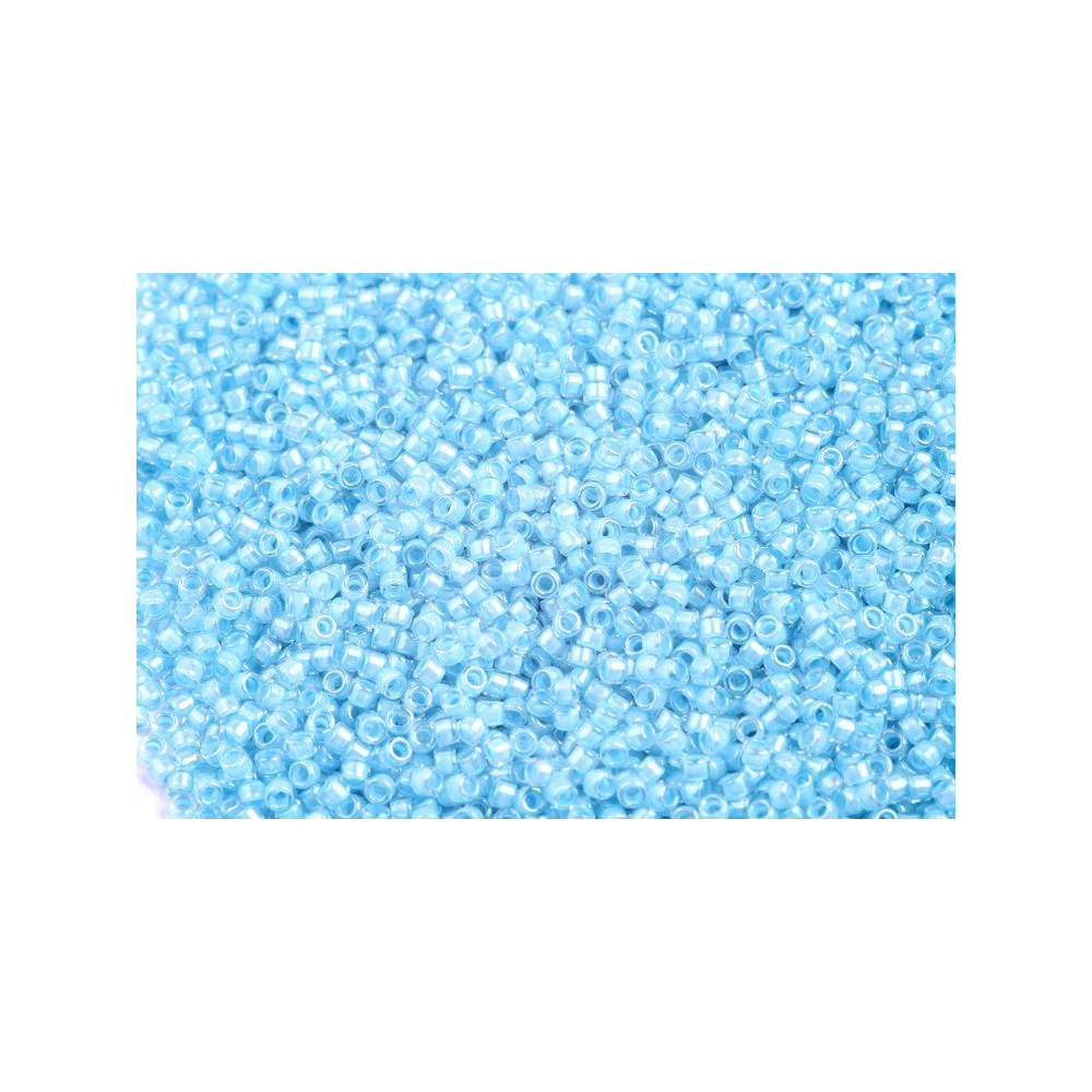 Světle modré jádro v křišťálovém obalu dodává korálkům hloubku a zajímavý vizuální efekt, který vynikne zejména v kombinaci s dalšími typy, jako je drobný TOHO Round 15/0 pro jemné začištění okrajů nebo klasický TOHO Round 11/0. Krásně ladí s opálovými nebo mléčnými tóny, ale pro dosažení moderního vzhledu je můžete kombinovat také s neutrálními stříbrnými akcenty či kontrastním černým jetem. Široký vnitřní průtah 0,9 mm usnadňuje vícečetné provlékání nitě, což oceníte u náročnějších technik, jako je brick stitch, herringbone nebo tkaní na stávku.