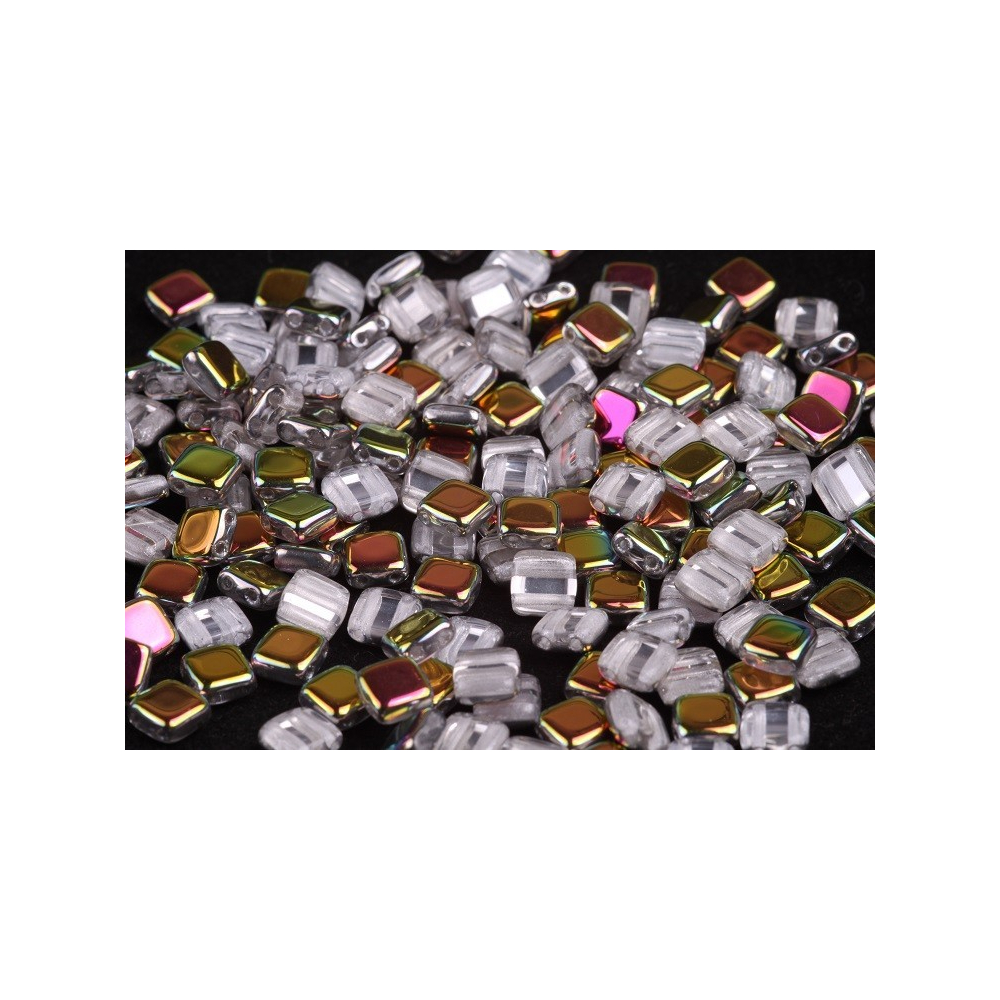 Duhovými odlesky hrající povrchová úprava Crystal Marea na čirém skleněném základu přináší do vaší tvorby neopakovatelný jas tradičního českého sklářství. Tyto ručně mačkané dvoudírkové čtverečky, známé pod názvem Tile Beads, pocházejí z dílny rodinné firmy Rutkovský, kde se řemeslo dědí po generace. Díky svému geometrickému tvaru o rozměru 6 x 6 mm jsou naprosto ideální pro vytváření bohatých textur v kombinaci s korálky Matubo™ SuperDuo, kdy společně tvoří fascinující mozaikové vzory. Tato barevná varianta krásně ladí se šedými odstíny, ale pro výrazný kontrast ji můžete zkombinovat i se safírově modrou pro luxusní vzhled.