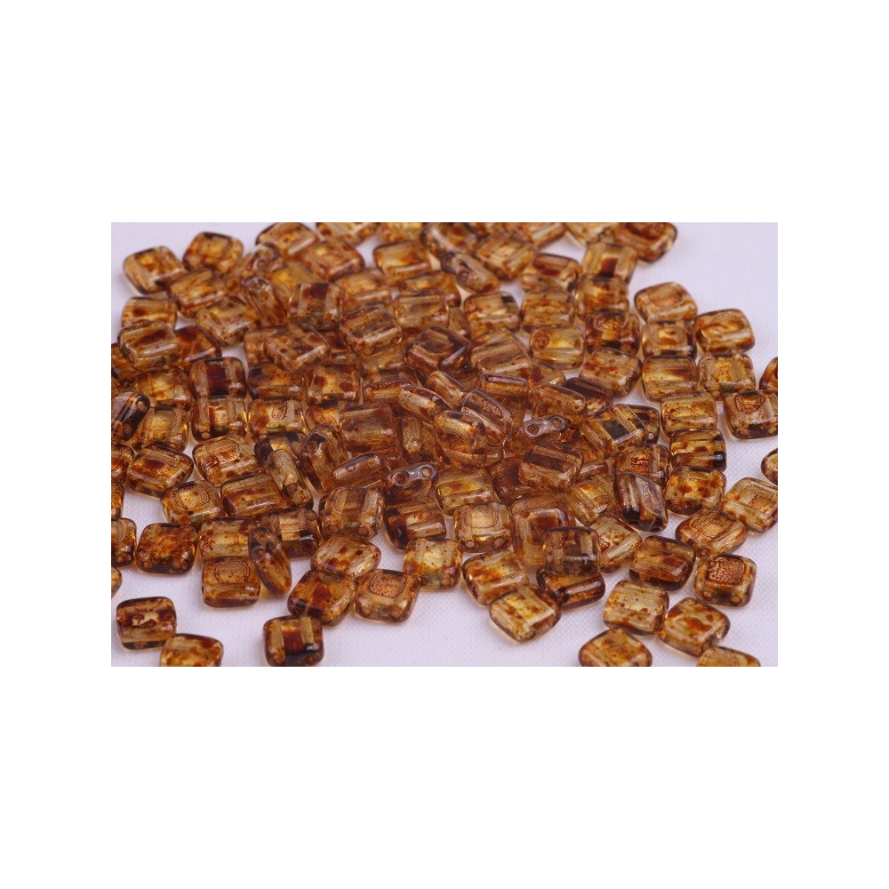 Křišťálový základ s hnědým žíháním dodává těmto dvoudírkovým čtverečkům autentický vzhled přírodního kamene s jemnou patinou. Tyto Tile Beads o rozměru 6 x 6 mm z dílny rodinné firmy Rutkovský představují vrchol tradičního českého sklářství a precizní ruční výroby. V plochých tkacích vzorech se dají skvěle kombinovat s materiálem jako je rokajl Preciosa, čímž vytvoříte dokonale hladké a strukturálně pevné šperky.