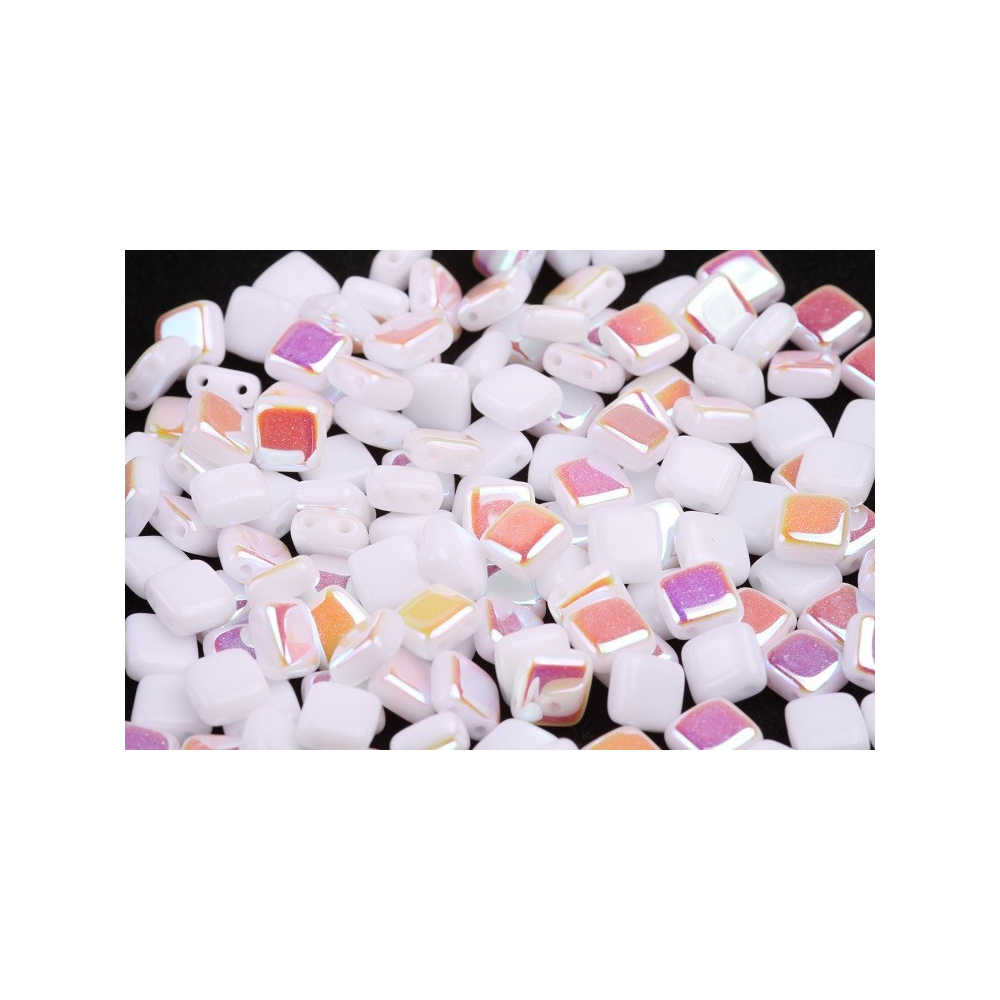 Bělavý odstín alabastru se jemně snoubí s duhovými odlesky povrchové úpravy AB, což těmto korálkům dodává snový a luxusní nádech. Dvoudírkové čtverečky, známé pod mezinárodním názvem Tile beads, představují ideální základ pro geometricky přesné a stabilní konstrukce v bižuterní tvorbě. Tyto české skleněné korálky z dílny rodinné firmy Rutkovský vynikají precizním zpracováním a hladkým povrchem, který odráží světlo v jemných pastelových tónech.