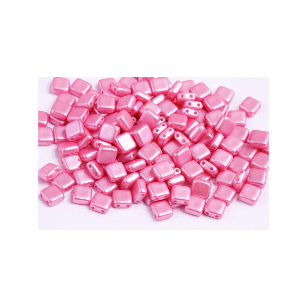 Růžová barva s jemným saténovým odleskem definuje tyto dvoudírkové čtverečky, známé také pod mezinárodním názvem Tile Beads. Tento specifický tvar od rodinné firmy Rutkovský představuje vrchol tradičního českého sklářství, kde se klade důraz na precizní lisování a konzistentní kvalitu každého kusu. Na rozdíl od běžného rokajlu nabízejí tyto korálky díky dvěma dírkám stabilitu a možnost vytvářet geometricky přesné vzory v plochých šicích technikách.