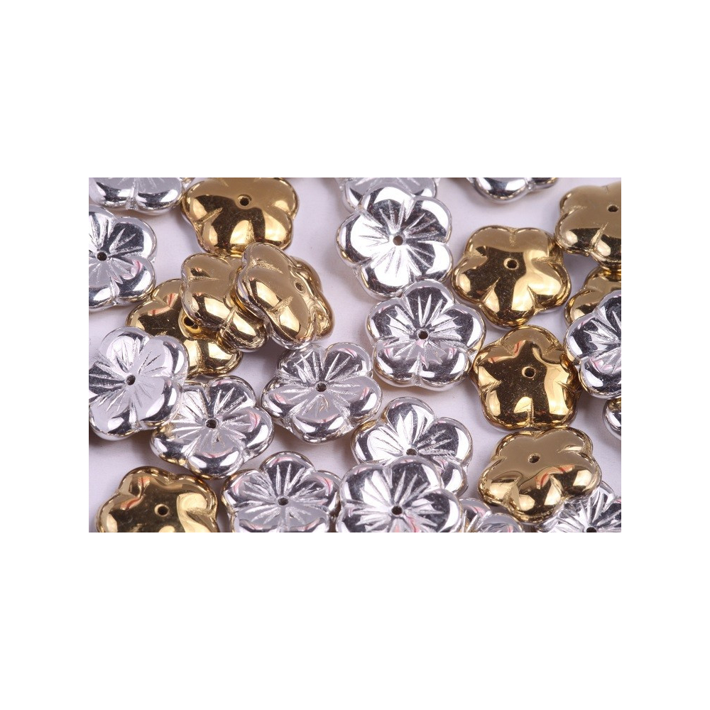 Apple Flower Beads v exkluzivní povrchové úpravě Crystal California Silver nabízejí fascinující hru světla díky svému intenzivnímu kovovému lesku. Tento specifický finiš kombinuje stříbrné a zlatavé odlesky, což z nich činí ideální komponent pro náročné šperkařské projekty a luxusní autorskou bižuterii s nádechem historie.