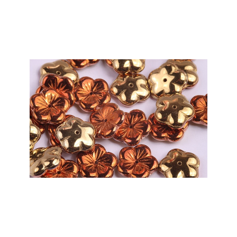 Rozměr 14 x 14 mm činí z těchto prvků výrazný, ale stále decentní komponent pro náhrdelníky i náramky. Korálky Jabloňový květ vynikají precizním zpracováním z dílny českého výrobce Rutkovsky a jejich unikátní povrchová úprava California Golden Rush vytváří fascinující metalické odlesky, které se mění od teplé zlaté až po sytou měděnou barvu.
