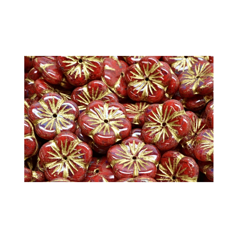 Červená barva s hlubokým zlatým dekorem v detailech okvětních lístků okamžitě přitáhne pozornost a dodá vašim projektům nádech luxusu. Tyto mačkané korálky ve tvaru jabloňového květu (Apple Flower Beads) pocházejí z proslulé české dílny Rutkovsky, kde se tradice pojí s precizním zpracováním. Na rozdíl od běžných plochých kytiček disponují tyto korálky plastickým reliéfem, který díky zlatému lůstru vytváří fascinující hru světla a stínu.