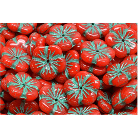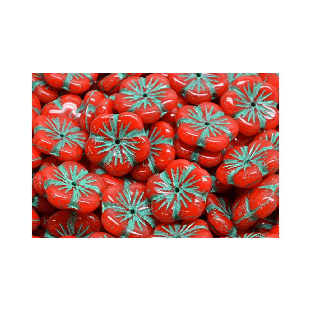 Sytě červená barva se specifickou tyrkysovou patinou v rýhách okvětních lístků definuje tyto výrazné mačkané korálky. Povrchová úprava Picasso dodává každému kusu rustikální vzhled, který vynikne v etno špercích i romantických doplňcích. České skleněné korálky značky Rutkovsky jsou zárukou vysoké kvality a precizního zpracování každého detailu u tvaru Jabloňový květ.