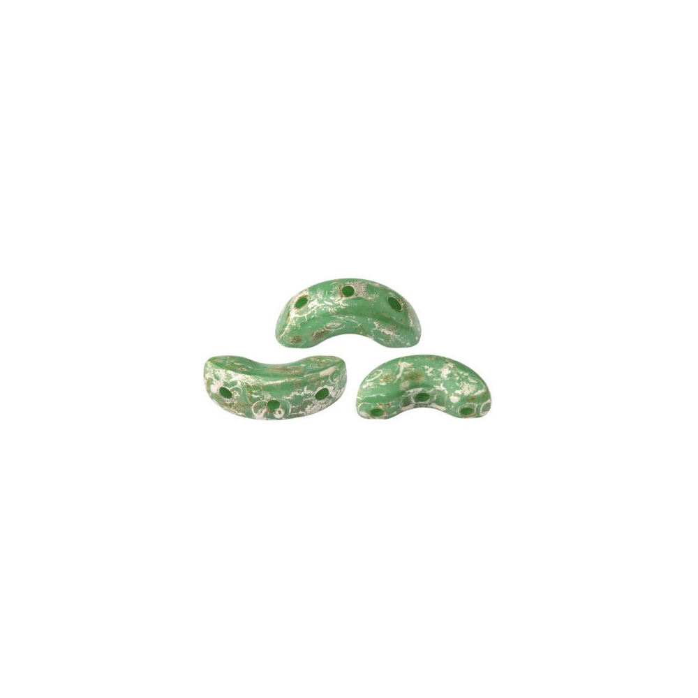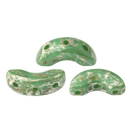Smaragdově zelené tóny s nádechem antické patiny připomínají vzácné poklady nalezené v hlubinách lesa nebo na dně oceánu. Tyto unikátní skleněné mačkané korálky Arcos® par Puca® o velikosti 5 x 10 mm v odstínu Opaque Green Turquoise New Picasso vnášejí do každého autorského šperku prvek organické krásy a rafinované elegance. Díky svému specifickému tvaru půlměsíce a třem dírkám jsou naprosto nepostradatelné pro milovníky beadweavingu, kde umožňují vytvářet složité geometrické vzory, mandaly a fascinující prostorové textury.