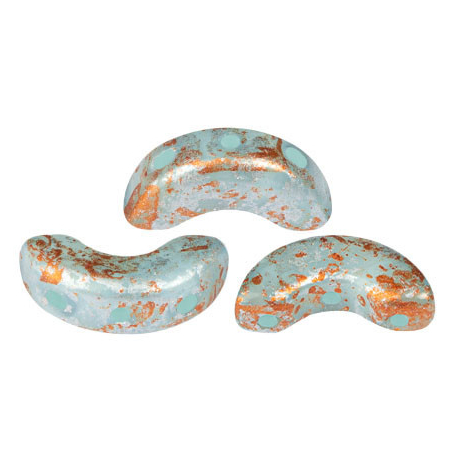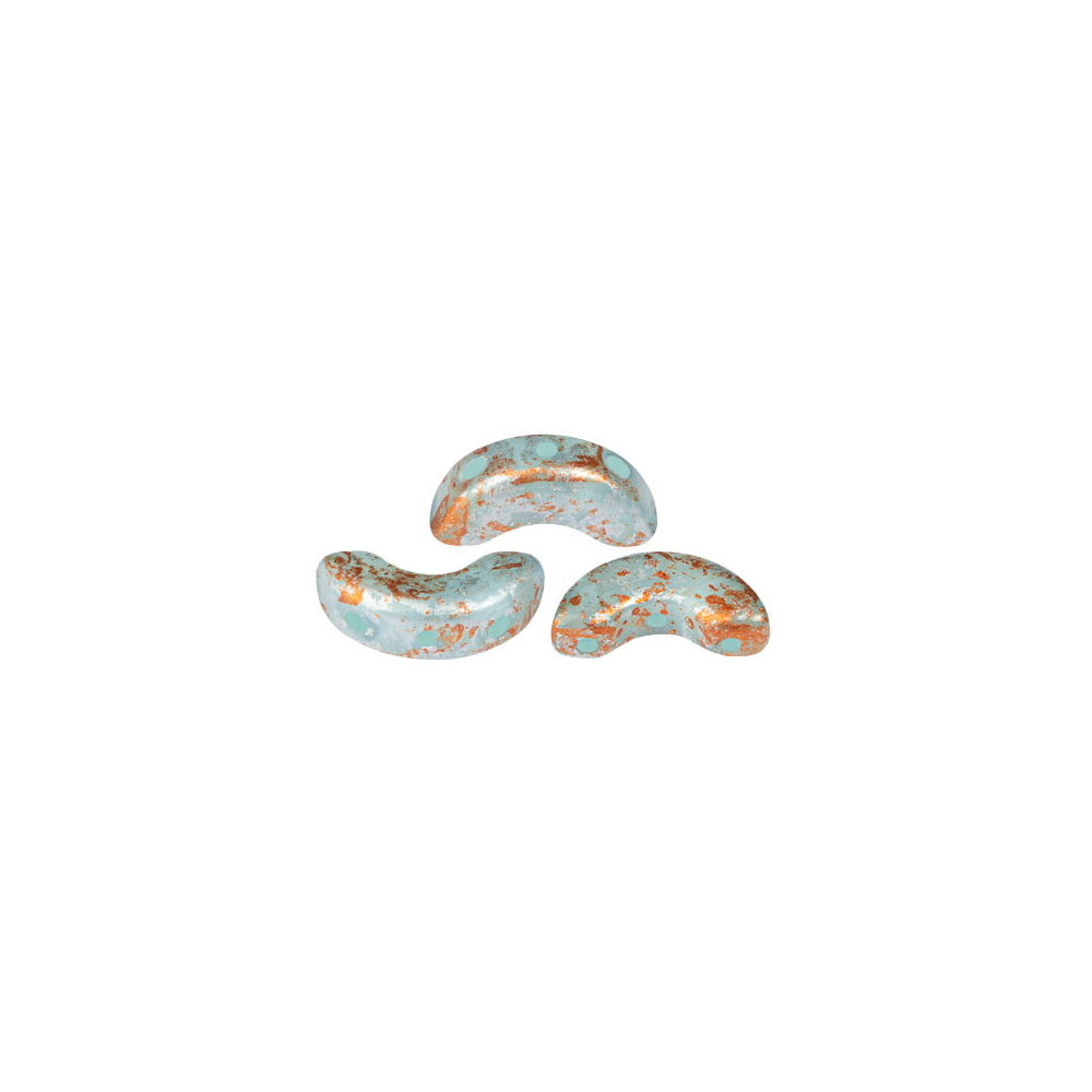 Tyrkysové a měděné tóny v úpravě Frost Azurin Tweedy aktuálně dominují světu autorské bižuterie, kde vnášejí do projektů nádech vintage elegance. Tyto unikátní skleněné mačkané korálky představují dokonalé spojení francouzského designu Annick Puca a české sklářské tradice. Díky svému specifickému tvaru měsíčku a třem dírkám jsou ideální pro vytváření bohatých krajkových vzorů, kde skvěle poslouží rokajl Preciosa jako jemná výplň mezi jednotlivými oblouky.