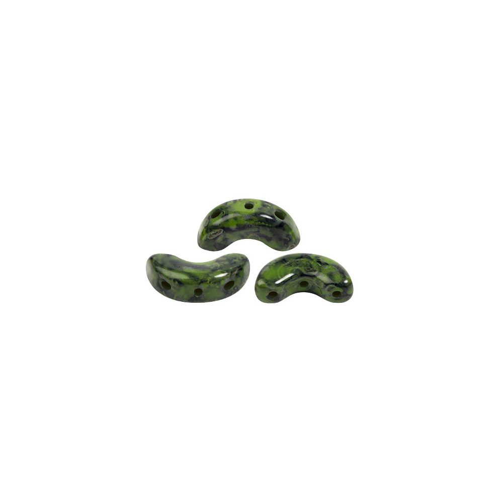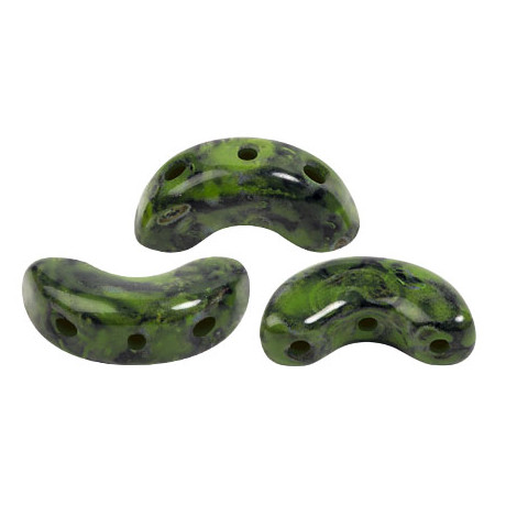 Sytá barva Black Stony Green vyniká svým lesklým povrchem, který krásně odráží světlo a zvýrazňuje mramorovaný efekt. Pro dosažení harmonického vzhledu v technice beadweaving doporučujeme párování s hematitovou barvou, zatímco čirý crystal vytvoří osvěžující kontrast. Jako výplň drobných mezer v Arcos vzorech se skvěle hodí drobný rokajl Preciosa, který podpoří stabilitu celého díla.