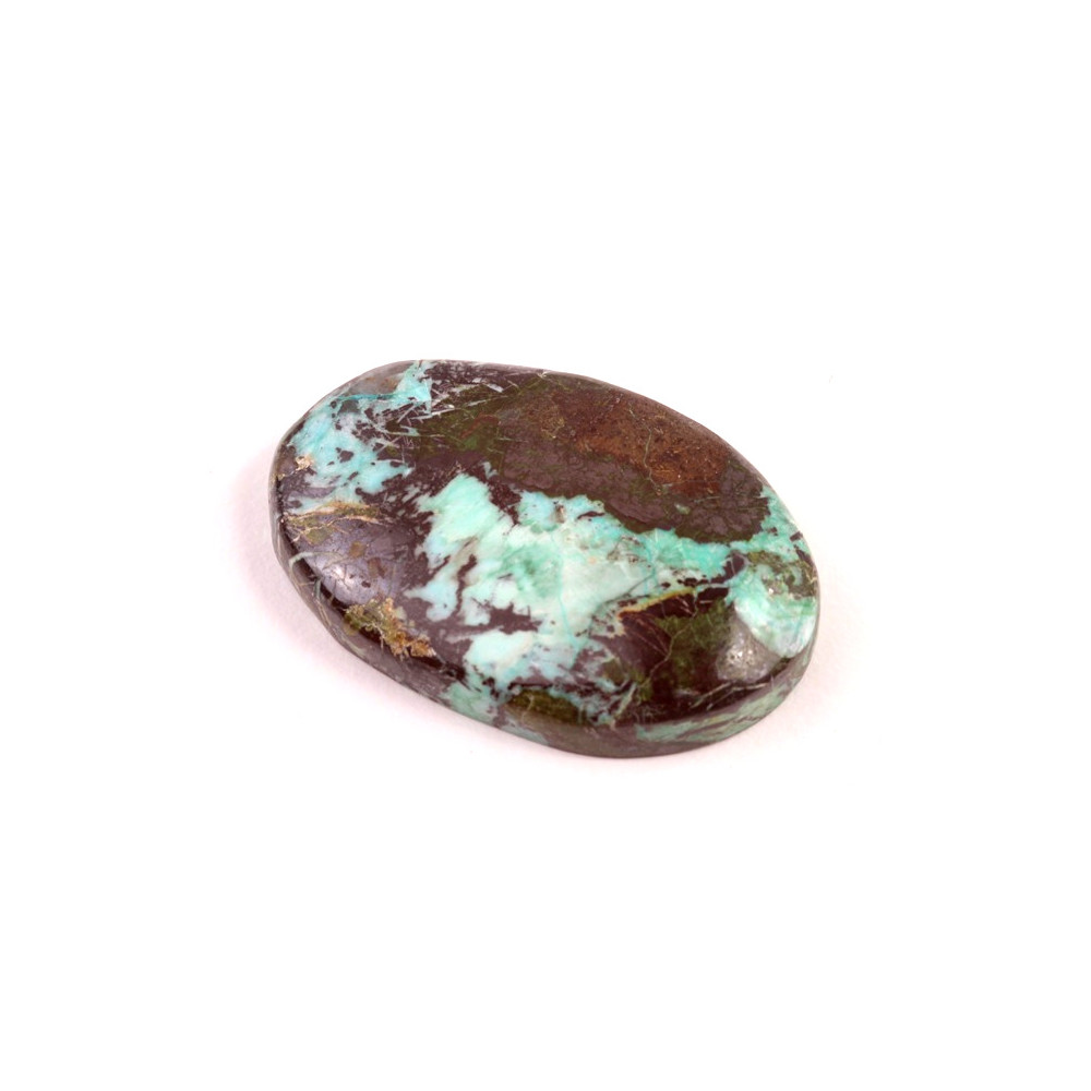 Kabošon z přírodního kamene Azurit Turquoise je fascinující kombinací dvou úchvatných minerálů – azuritu a tyrkysu. Tento klenot spojuje hluboké tóny hnědé, tyrkysově modré a jemné zelené, vytvářející unikátní přírodní mozaiku, která upoutá na první pohled. Přirozená textura a syté odstíny dělají z tohoto kabošonu jedinečný šperk, který vnese do vašich návrhů přírodní krásu a eleganci.