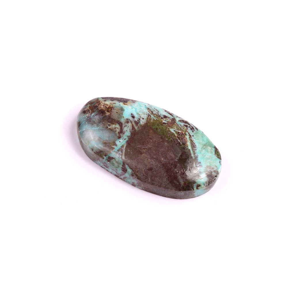 Kabošon z přírodního kamene Azurit Turquoise je fascinující kombinací dvou úchvatných minerálů – azuritu a tyrkysu. Tento klenot spojuje hluboké tóny hnědé, tyrkysově modré a jemné zelené, vytvářející unikátní přírodní mozaiku, která upoutá na první pohled. Přirozená textura a syté odstíny dělají z tohoto kabošonu jedinečný šperk, který vnese do vašich návrhů přírodní krásu a eleganci.