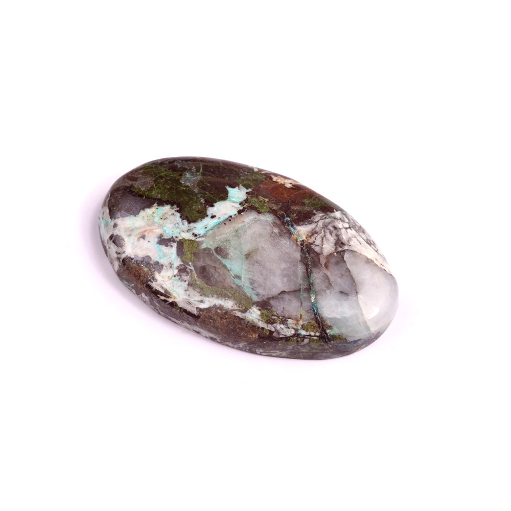 Kabošon z přírodního kamene Azurit Turquoise je fascinující kombinací dvou úchvatných minerálů – azuritu a tyrkysu. Tento klenot spojuje hluboké tóny hnědé, tyrkysově modré a jemné zelené, vytvářející unikátní přírodní mozaiku, která upoutá na první pohled. Přirozená textura a syté odstíny dělají z tohoto kabošonu jedinečný šperk, který vnese do vašich návrhů přírodní krásu a eleganci.