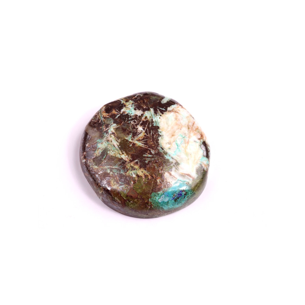 Kabošon z přírodního kamene Azurit Turquoise je fascinující kombinací dvou úchvatných minerálů – azuritu a tyrkysu. Tento klenot spojuje hluboké tóny hnědé, tyrkysově modré a jemné zelené, vytvářející unikátní přírodní mozaiku, která upoutá na první pohled. Přirozená textura a syté odstíny dělají z tohoto kabošonu jedinečný šperk, který vnese do vašich návrhů přírodní krásu a eleganci.