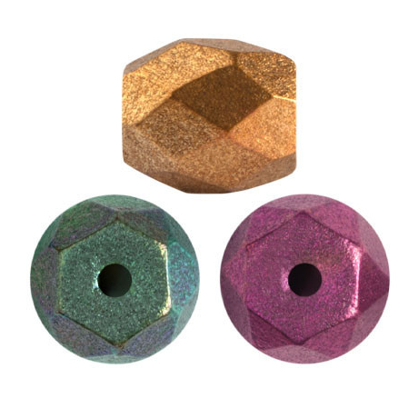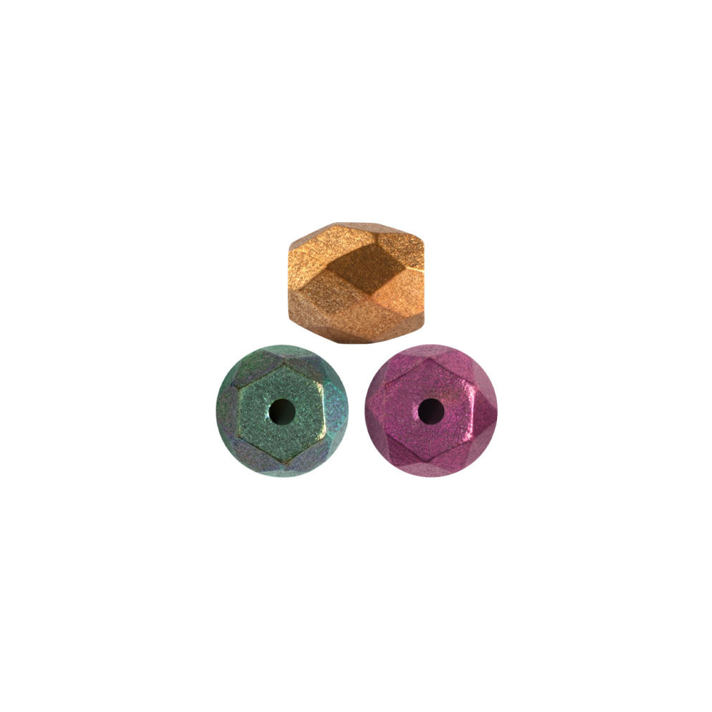 Povrchová úprava YELLOW GOLD METALLIC IRIS s kódem barvy 00030-01620 dodává sklu hluboký kovový lesk s jemnými měňavými odlesky. Výrazný iris efekt reaguje na dopadající světlo a podtrhuje fazetování korálku, čímž dodává výslednému šperku luxusní a dramatický vzhled. Kvalitní sklo použité při výrobě zajišťuje, že si korálek zachová svůj brilantní vzhled i při častém nošení hotového doplňku.