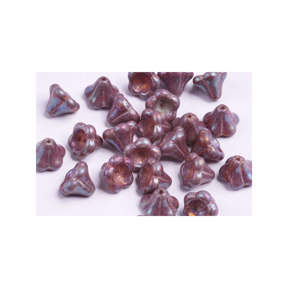 Fialová barva s jemným duhovým odleskem zdobí tyto mačkané skleněné korálky ve tvaru kytiček, které se v českých sklárnách Rutkovský vyrábějí tradičními metodami z prvotřídní skloviny. Každý květinový zvonek o rozměru 11 x 13 mm vyniká precizním tvarováním okvětních lístků a lesklým povrchem, který připomíná luxusní patinu. Pro vytvoření bohatého floristického designu doporučujeme jako doplňkový materiál rokajl Preciosa, který poslouží jako jemný řetízek nebo výplň mezi jednotlivými květy.