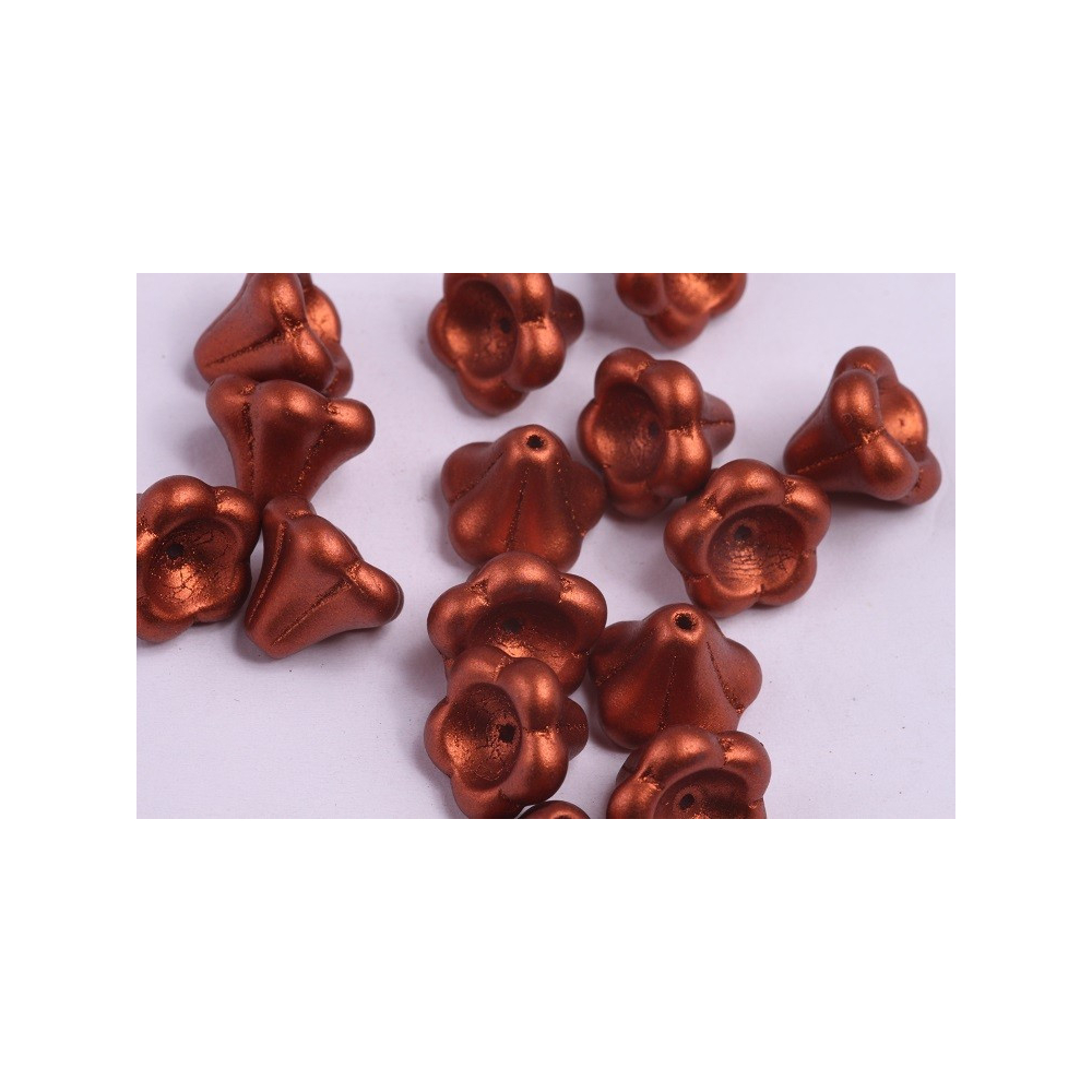 Sytý metalický odstín bronzové barvy s červeným nádechem dominuje těmto precizně tvarovaným skleněným korálkům. Květinové zvonky o rozměru 11 x 13 mm pocházejí z tradiční české dílny Rutkovsky a vynikají svým detailním reliéfem připomínajícím rozkvetlou sukýnku. Povrchová úprava Bronze Fire Red dodává materiálu hloubku a sofistikovaný vzhled, který se mění v závislosti na úhlu dopadu světla.