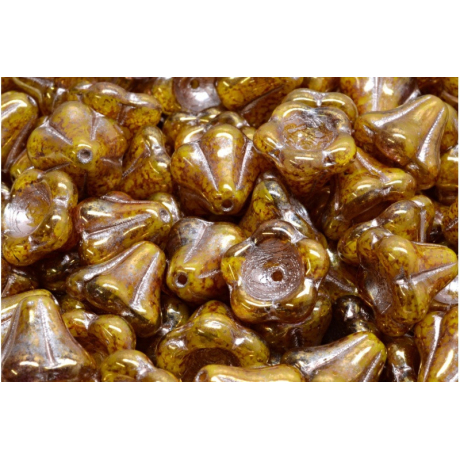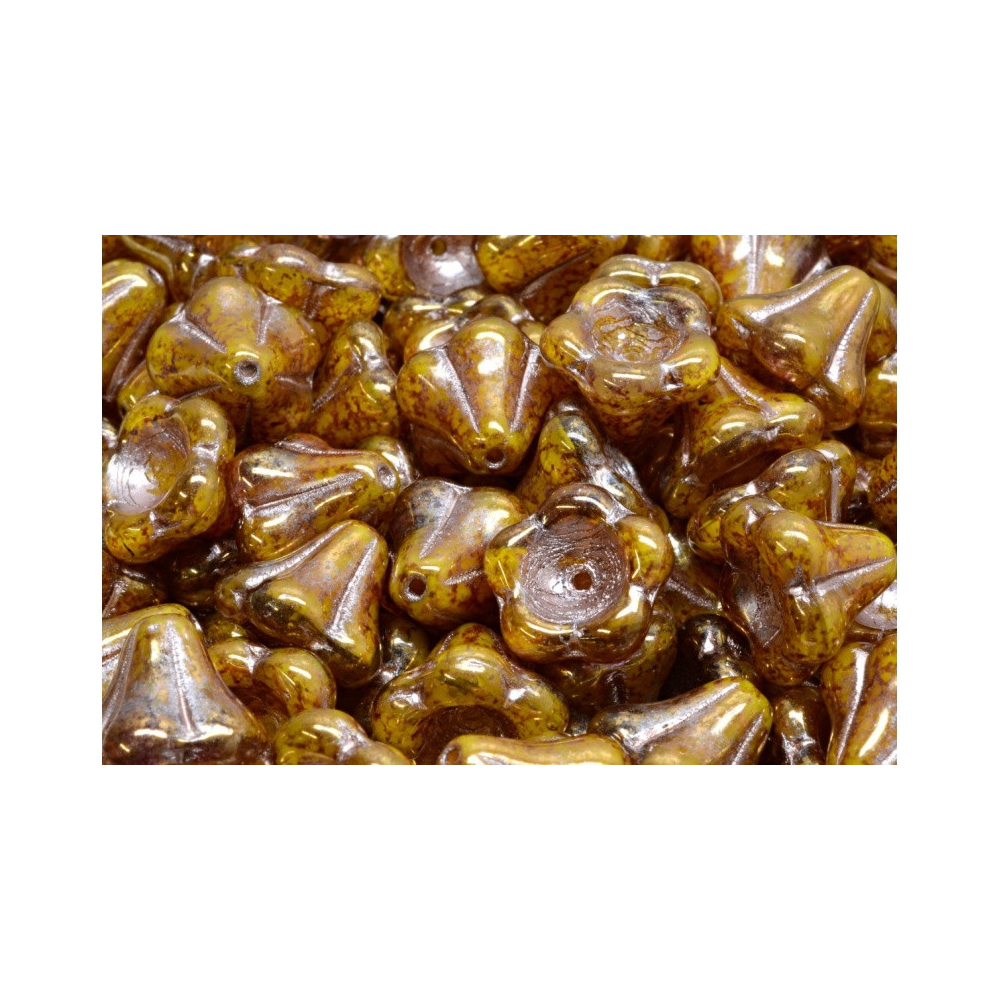 Žlutá barva s jemným bronzovým nádechem dodává těmto skleněným korálkům ve tvaru květinových zvonků neopakovatelný vintage charakter. Každý kus je výsledkem precizního českého řemesla z dílny Rutkovský, kde se tradiční techniky mačkání skla snoubí s moderními povrchovými úpravami pro dosažení maximální estetické hodnoty.