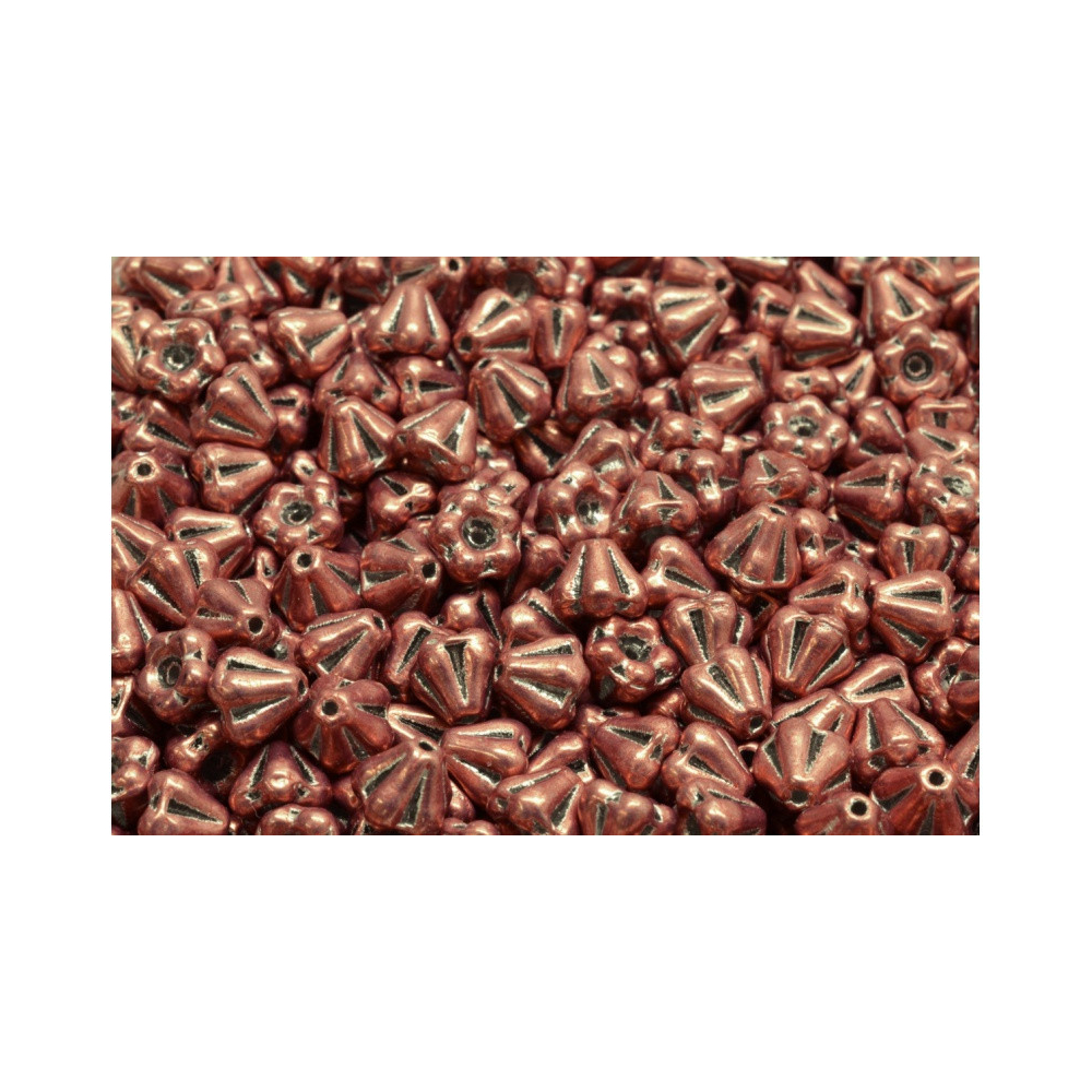 Měděná povrchová úprava s hlubokým kovovým odleskem definuje tyto precizně lisované české skleněné korálky od renomovaného výrobce Rutkovsky. Model Bell Flower Beads 4 x 6 mm, v českém prostředí známý jako Korálky Květinové zvonky, vyniká dokonalou rozměrovou stálostí a čistým průtahem o velikosti 0,8 mm, což zajišťuje hladký průchod jehly při víceřadém šití. Při modelování prostorových florálních motivů se tyto prvky ideálně doplňují se součástmi, jako jsou skleněné kuličky, které v květech plní funkci stabilních středových bodů a dodávají šperku potřebnou hloubku.