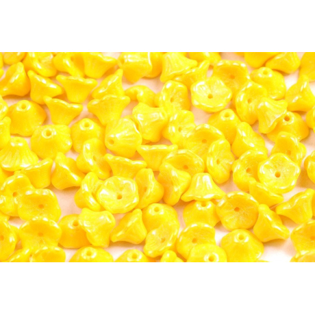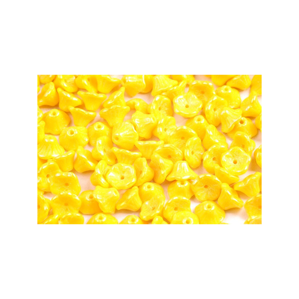 Žlutá barva s iridescentním odleskem definuje tyto skleněné korálky ve tvaru květinového zvonku. Precizní české sklo od výrobce Rutkovsky o velikosti 7 x 5 mm vyniká jemným žebrováním, které věrně imituje okvětní lístky. Při tvorbě náušnic nebo náhrdelníků je doplňte o skleněné lístečky pro dosažení autentického floristického vzhledu. Jasný odstín s duhovým finišem krásně ladí s šedými tóny a stříbrnými komponenty, zatímco pro výrazný kontrast doporučujeme kombinaci s korálky v barvě černý jet.