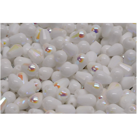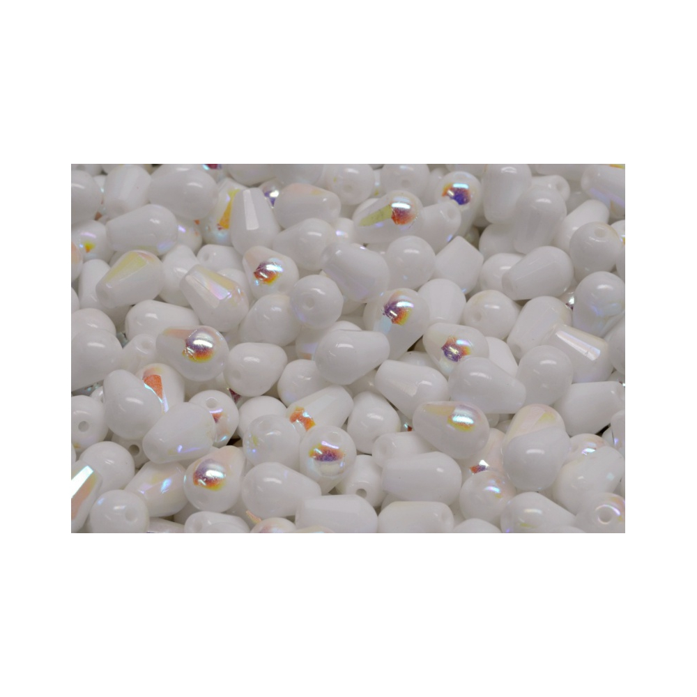 Bílý neprůhledný základ s jemným AB odleskem definuje tyto Firepolished Drop Beads o rozměru 8 x 6 mm. Tento tvar broušené kapky patří k tradičním prvkům českého sklářství, které rodinná firma Rutkovský udržuje a rozvíjí po generace v Jizerských horách.