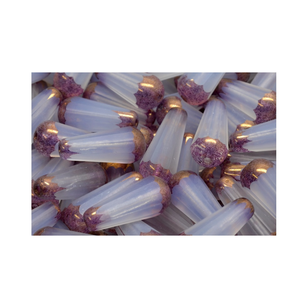 Mléčně bílé sklo s fialovým dekorem a bronzovým listrem definuje tyto Firepolished Drop Beads o rozměru 20 x 9 mm, dodávané v balení po 2 ks. Tyto české skleněné korálky z dílny rodinné firmy Rutkovský vynikají precizním zpracováním podélných faset, které zajišťují konzistentní odraz světla. Průtah o průměru 0,8 mm je přesně vycentrován v horní zúžené části kapky, což umožňuje hladké navlékání na běžné bižuterní dráty i pevnější nitě.