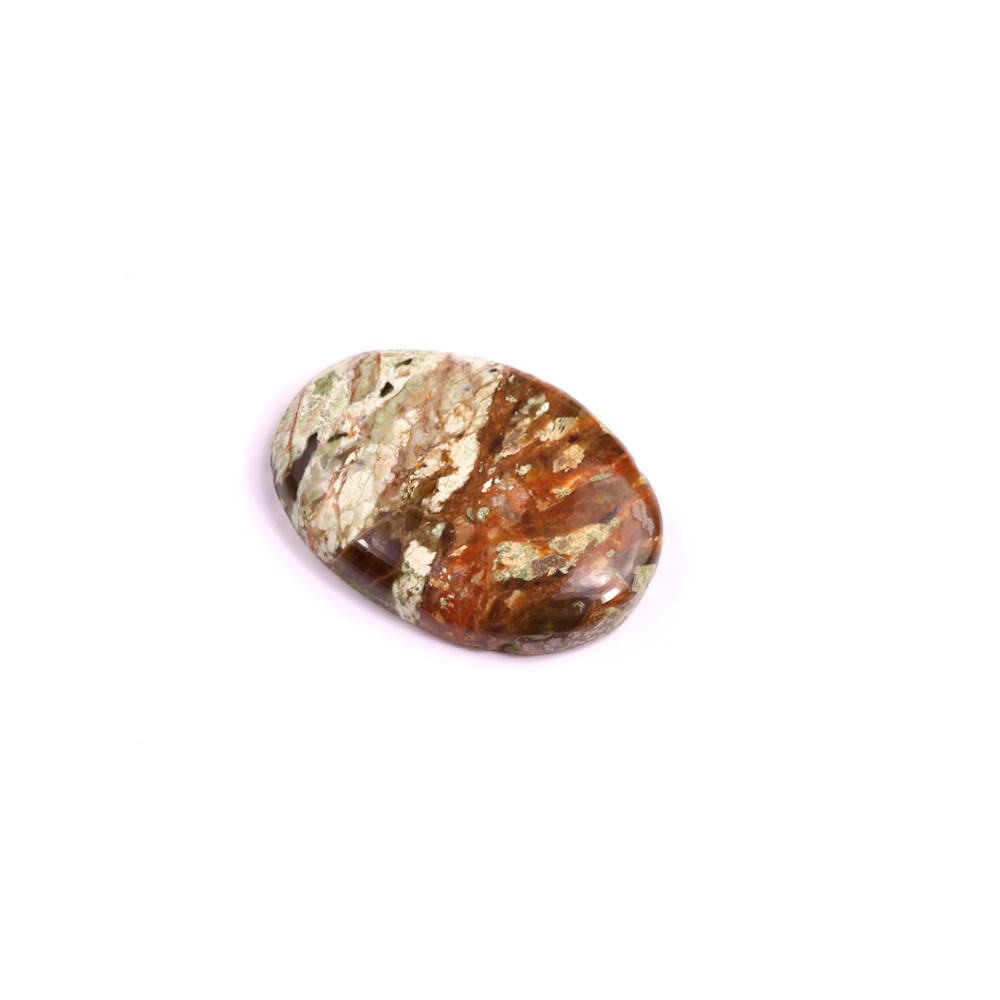 Kabošon z přírodního kamene Chrome Chalcedon (Chromový chalcedon) představuje unikátní a vzácný šperk přímo z přírody. Tento minerál je obdivován pro své jemné odstíny zelené až hnědé, které vznikají díky obsahu chromu. Každý kabošon je originální díky svým přírodním vzorům a kresbě, která připomíná malířské dílo.
