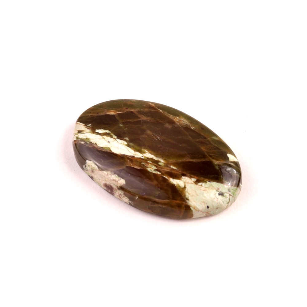 Kabošon z přírodního kamene Chrome Chalcedon (Chromový chalcedon) představuje unikátní a vzácný šperk přímo z přírody. Tento minerál je obdivován pro své jemné odstíny zelené až hnědé, které vznikají díky obsahu chromu. Každý kabošon je originální díky svým přírodním vzorům a kresbě, která připomíná malířské dílo.