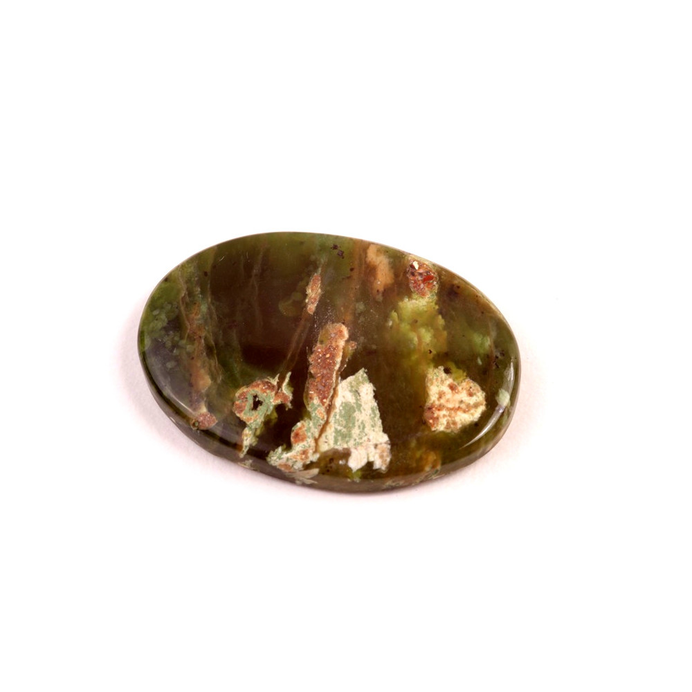 Kabošon z přírodního kamene Chrome Chalcedon (Chromový chalcedon) představuje unikátní a vzácný šperk přímo z přírody. Tento minerál je obdivován pro své jemné odstíny zelené až hnědé, které vznikají díky obsahu chromu. Každý kabošon je originální díky svým přírodním vzorům a kresbě, která připomíná malířské dílo.