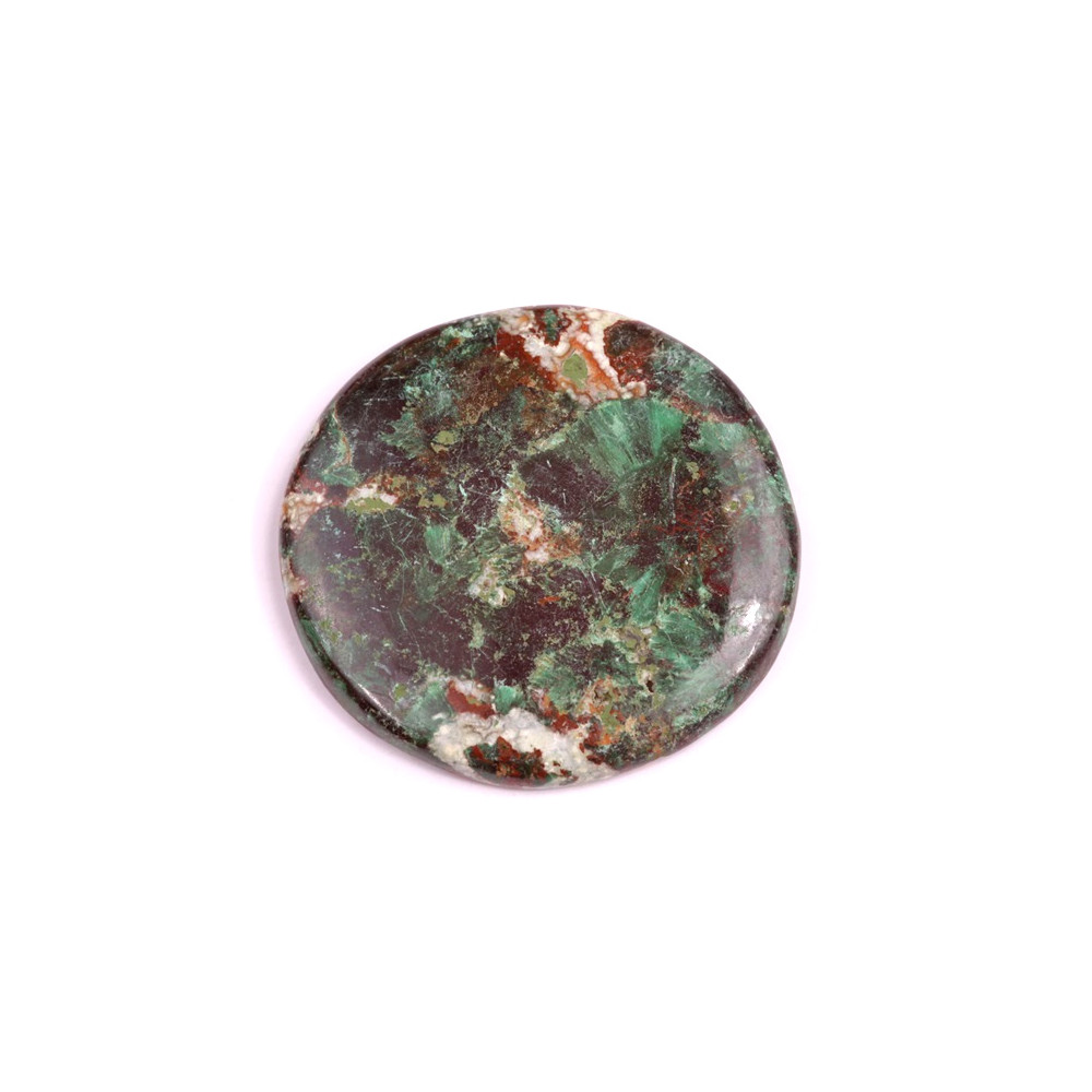 Kabošon z přírodního kamene chrysocolla je nádherným výtvorem přírody, který do vašich šperků vnese hluboký odstín zelené, často s jemnými modrými a tyrkysovými prvky. Chrysocolla je ceněna pro své uklidňující účinky a schopnost přinášet do života klid a harmonii. Tento minerál je známý svým působením na zklidnění emocí a podporu pozitivního myšlení, což z něj je ideální kámen pro meditativní a relaxační účely.