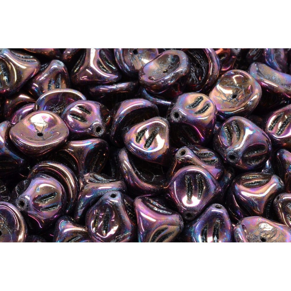 Fialová odlesky na temném podkladu definují tyto skleněné korálky ve tvaru květu Denivky. Povrchová úprava Jet Iris Luster dodává každému kusu výrazný kovový lesk, který se dynamicky mění podle úhlu dopadu světla od purpurové až po bronzovou.