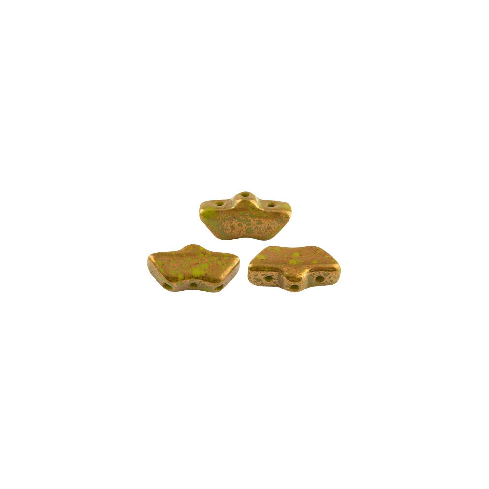Rozměry 6 x 11 mm a tři precizně umístěné otvory o průměru 0,8 mm dělají z korálků Delos® par Puca® č. 52 v barvě Opaque Green Bronze nepostradatelný prvek pro složité prostorové šperky. Tento unikátní tvar z dílny francouzské designérky Annick Puca je vyroben z kvalitního českého mačkaného skla, což zaručuje tvarovou stálost a hladké okraje otvorů, které nepoškozují návlekový materiál. Díky své geometrii se skvěle doplňují s dalšími tvary jako jsou Amos® par Puca® nebo Arcos® par Puca®, čímž umožňují vytvářet plynulé přechody v náročných vzorech.