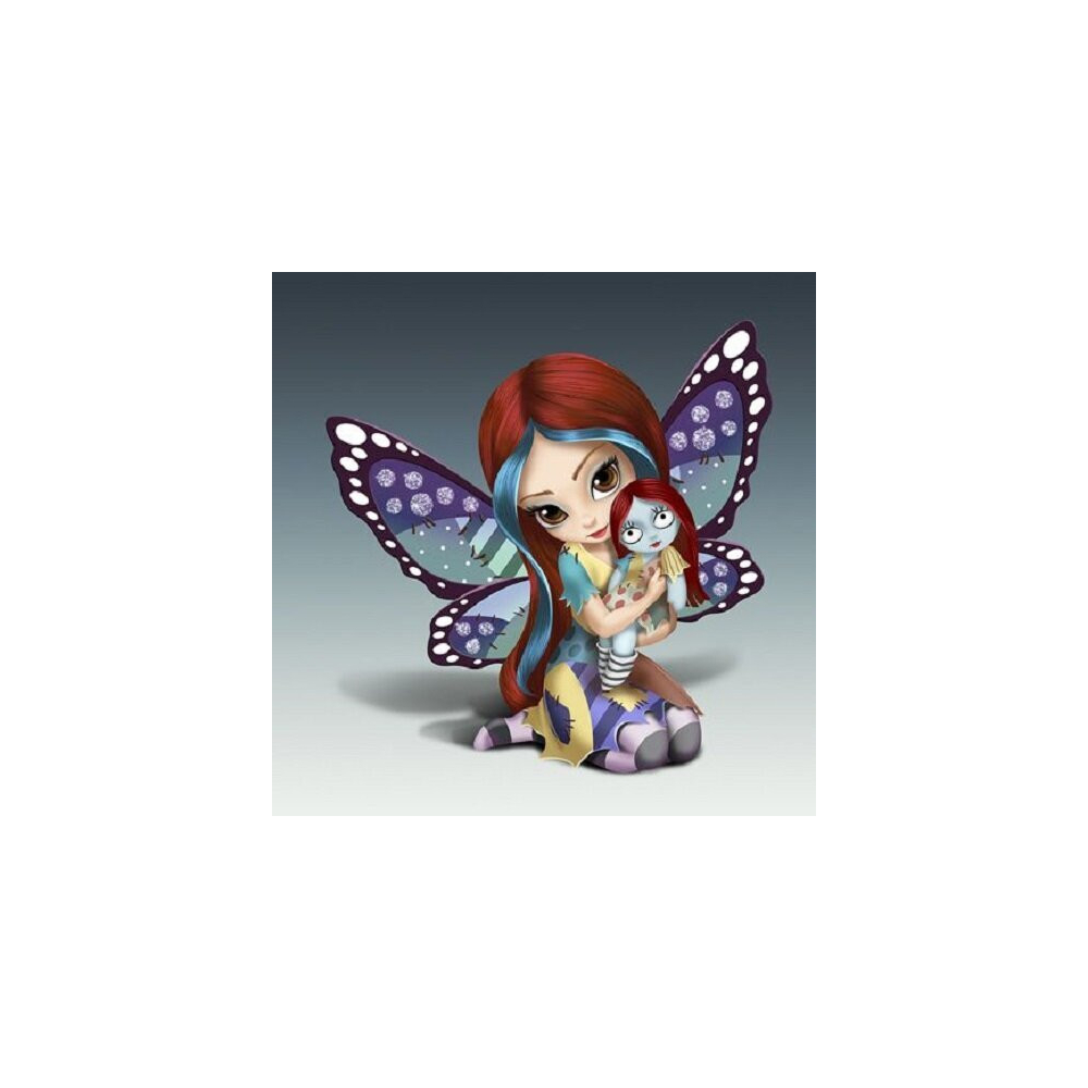 Obrázek pro diamantové malování zobrazuje půvabnou vílu s dlouhými rudými vlasy a široce rozevřenými křídly s fialovo-modrými vzory. V jejích náručích je svěřena panenka s pruhovaným oblečením, která přidává k obrazu nádech dětské nevinnosti. Pozadí je neutrální, což zvýrazňuje postavu a detaily, jako jsou víliny laskavé oči a jemné rysy. Tento obraz, doplněný o světélkující diamanty, se stane okouzlujícím doplňkem jakéhokoli interiéru a nabídne tvořivou zábavu pro začátečníky i pokročilé.