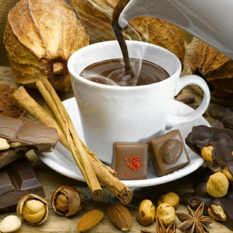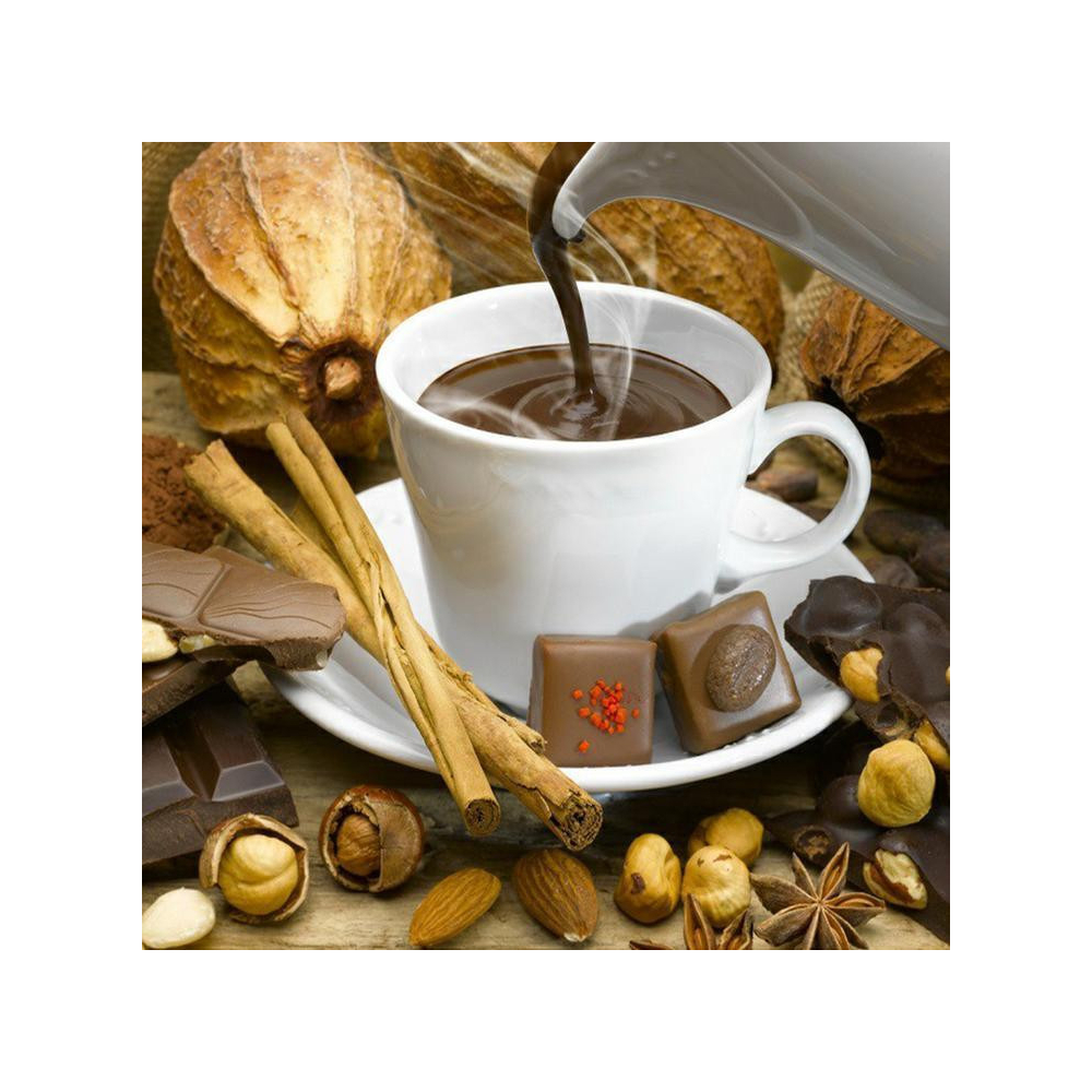 Diamantové malování "Kávová pohoda" zachycuje útulný moment pro milovníky kávy. Hrníček plný horké čokolády nebo kávy, obklopený čokoládou, skořicí a ořechy, evokuje teplý pocit domácí pohody. Detaily jako kroužky na povrchu nápoje a textura potravin jsou ideální pro zdůraznění pomocí diamantů, které dodají obrazu realistický vzhled.