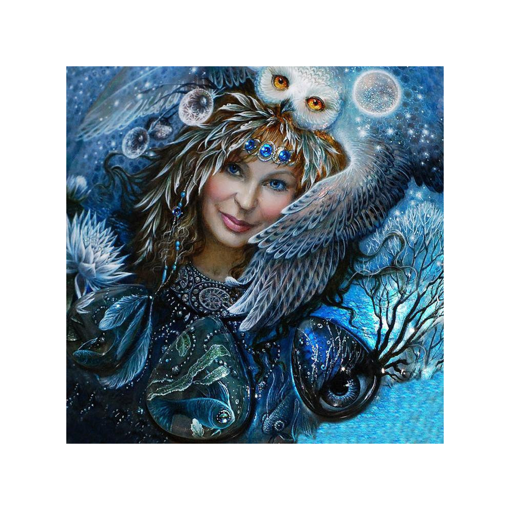 Diamantové malování "Sova a žena" přináší tajemný portrét spojující ženskou krásu s moudrostí sovy. Tato magická kompozice zdůrazněná modrými a stříbrnými tóny je ideální pro diamantové malování, které zdůrazňuje detaily pernatého peří a hypnotizujícího pohledu, přinášející do vašeho domova kus tajemna.