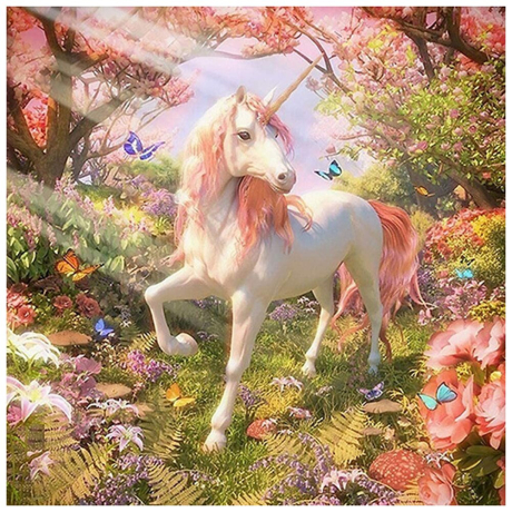 Kouzlo a nádhera fantazie ožívají v tomto okouzlujícím diamantovém malování jednorožce, které je dokonalým doplňkem pro každého milovníka mýtických bytostí. Tento set vám umožní vytvořit obraz plný života, kde dominuje bílý jednorožec s jemně růžovou hřívou a ocasem, klenoucí se nad magickou zahradou v plném květu.