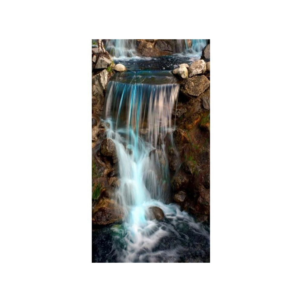 Diamantové malování "Hra světla na horském potoku" o rozměru 45x85 cm je působivým ztvárněním malebného vodopádu, kde se voda přelévá přes kamenné stupně do klidného jezírka.
