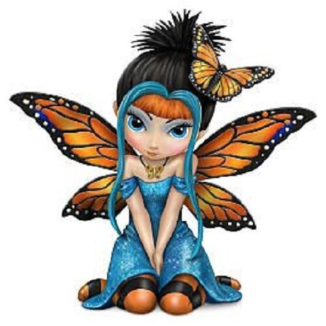 Tento nádherný set diamantového malování představuje okouzlující modrou vílu s křídly motýla, která sedí se skloněnou hlavou a je zdánlivě zamyšlená. Její křídla mají živé oranžové a černé odstíny s doteky modré, které krásně kontrastují s jejím modrým šatem posetým drobnými třpytkami, připomínajícími kouzelný prach.