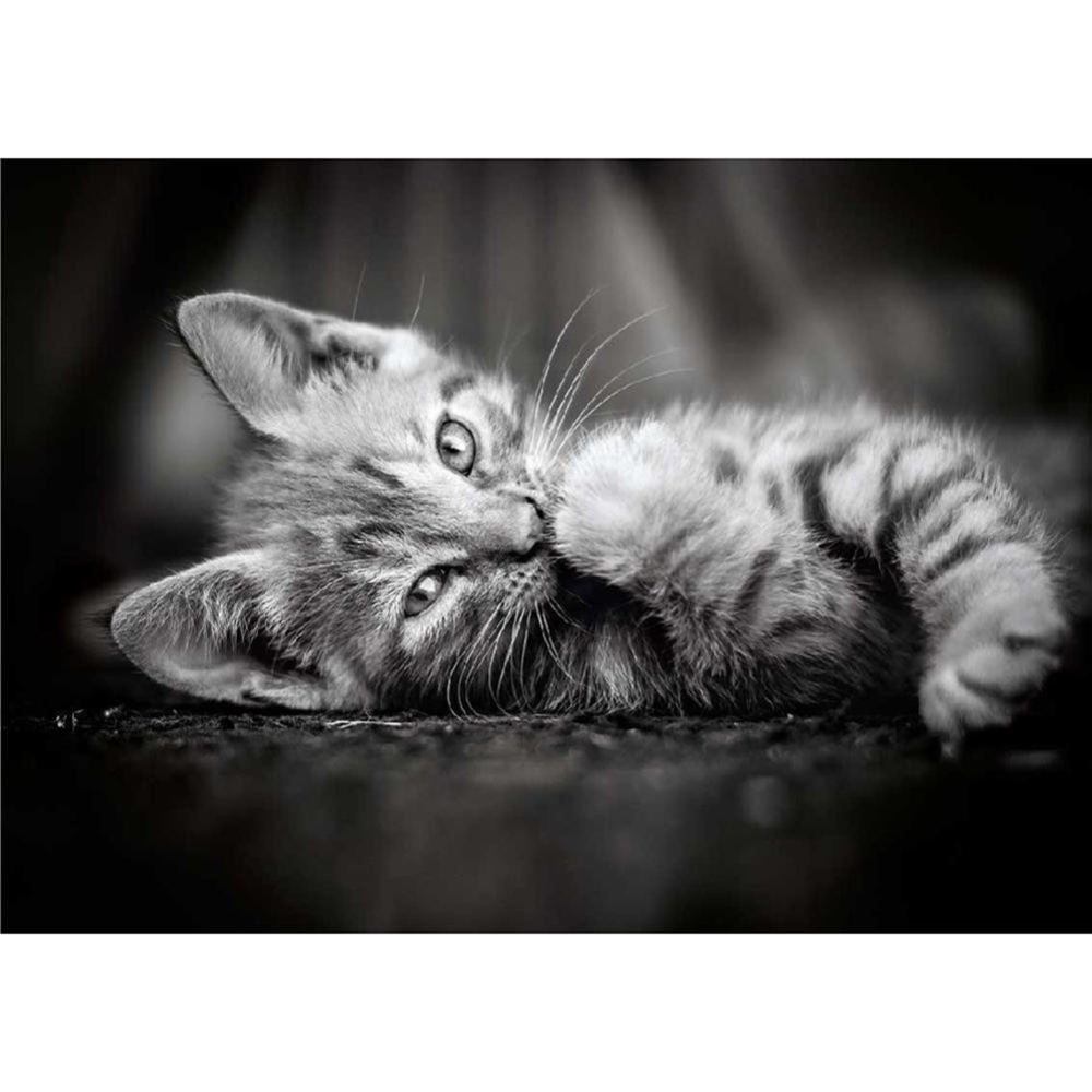 Diamantové malování přináší do vašeho domova podmanivý obraz roztomilého koťátka, zachyceného v klidné póze s třpytícími se očima, které vynikají v černobílém provedení. Jemné šerosvětlé tóny kožíšku a realistické detaily srsti dodávají tomuto dílu hloubku a texturu. Ideální pro milovníky koček a umění, který hledají relaxační a esteticky přitažlivý projekt.