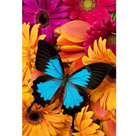 Toto diamantové malování představuje živý obraz modrého motýla v plném rozletu, který kontrastuje s bohatým spektrem barev rozkvetlých květů. Jednotlivé diamantové kamínky přidávají detail a hloubku k celé kompozici, zatímco odstíny žluté, oranžové a růžové vytvářejí teplý a lákavý vizuální efekt.