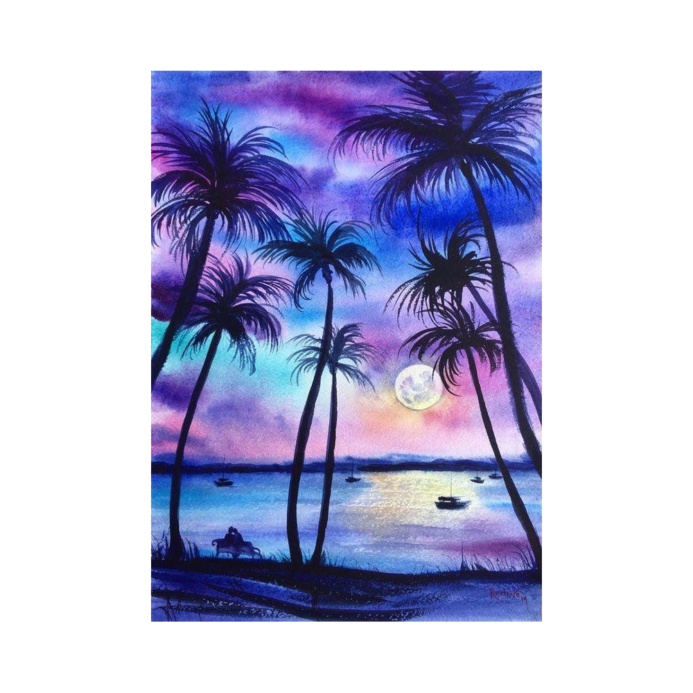 Toto diamantové malování vás zavede do klidné tropické noci, kde se palmy houpají ve vánku a měsíc se zářivě odráží na klidném moři. Barevný gradient oblohy od tmavě modré přes fialovou až po růžovou vytváří hypnotizující pozadí, proti kterému se rýsují siluety plujících lodí.