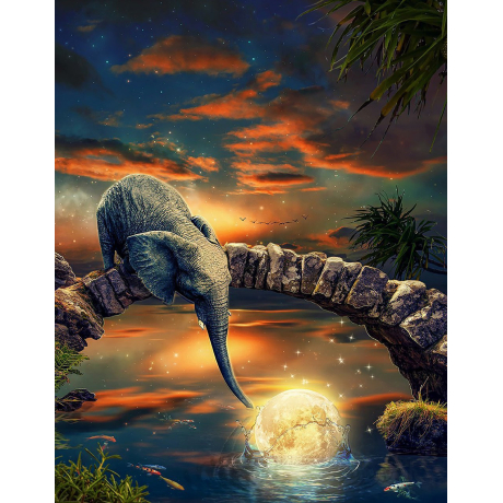 Objevte kouzlo noční oblohy s naším diamantovým malováním, kde slon něžně sahá svým chobotem k osvětlenému měsíci. Každý lesklý diamant přispívá k celkové mystické atmosféře, zatímco odraz vodní hladiny přidává hloubku a klid do každého koutu vašeho domova. Tento set je perfektním projektem pro ty, kteří hledají odpočinkovou aktivitu s fascinujícím výsledkem.