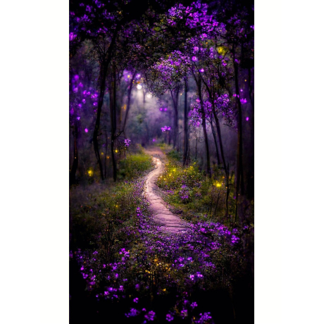 Tato diamantová malovací sada zobrazuje tajemný les s cestou protkanou barevnými listy, ideální...