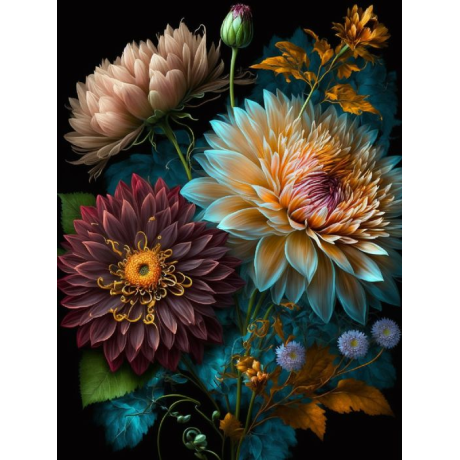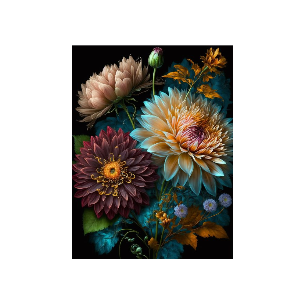Toto bohatě ilustrované diamantové malování nabízí dechberoucí kompozici několika květin v plném květu, které jsou znázorněny s ohromujícími detaily a živými barvami. Centrální místo zaujímají dva nádherné květy, jeden v teplých odstínech krémové a oranžové a druhý v hluboké vínově červené barvě, oba s výraznými žlutými středy a delikátně vykreslenými detaily, které napodobují skutečné textury a odlesky světla na okvětních lístcích.