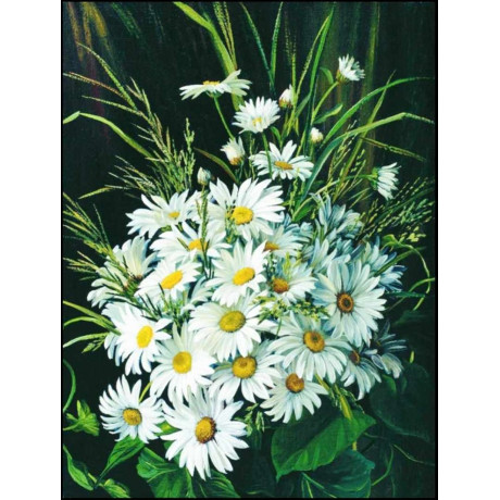 Odhalte jemnost a krásu přírody s diamantovým malováním, které ztvárňuje bujný svazek kopretin. Tyto květiny jsou zobrazeny s živými bílými okvětními lístky a zářivě žlutými středy, které kontrastují s tmavým pozadím a zelenými listy, dodávajícími tomuto dílu bohatou paletu barev.
