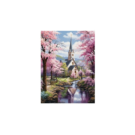Toto diamantové malování představuje malebný výjev kostela obklopeného rozkvetlými sakurami, který vyzařuje klid a mír. Kostel s vysokou, štíhlou věží a špičatou střechou je umístěn uprostřed jarního ráje, s růžovými květy japonských třešní, které přidávají scéně pocit svěžesti a nového začátku.