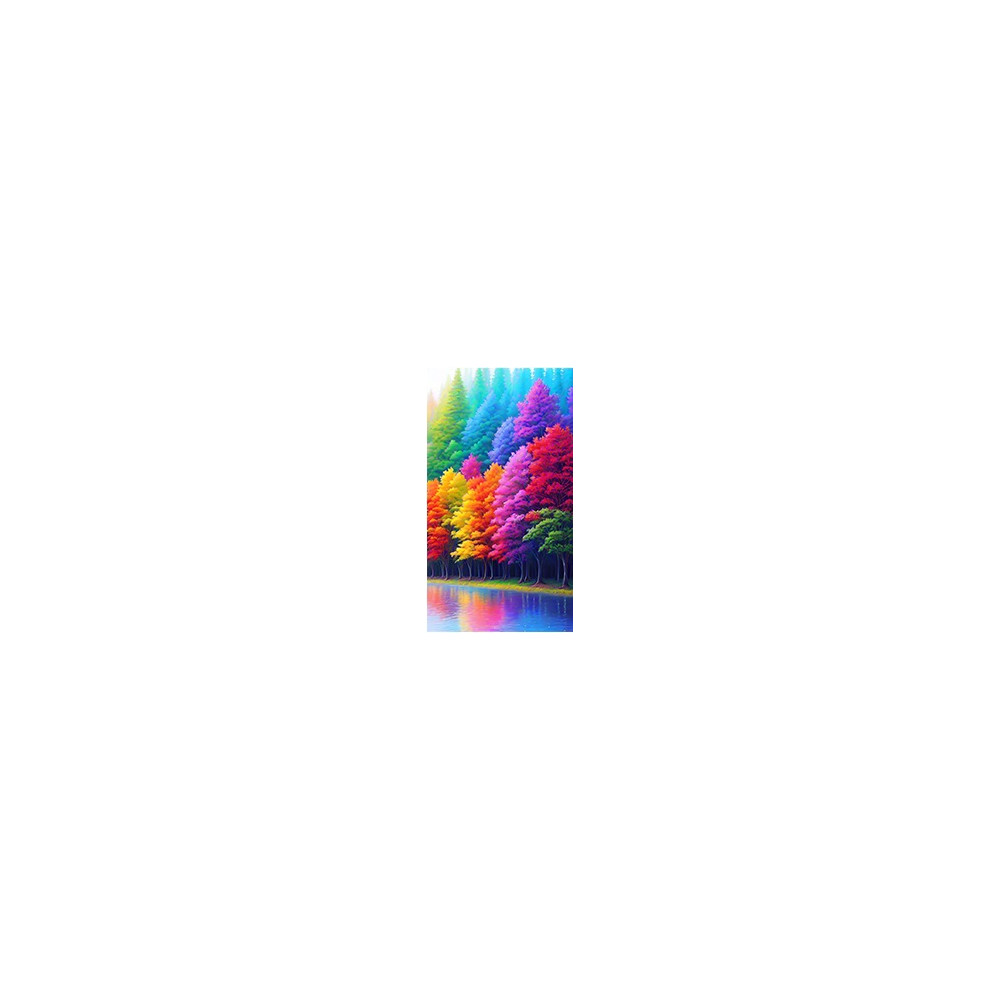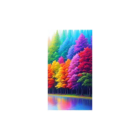 Obraz ukazuje řadu stromů s listy v přechodových barvách duhy, od tónů teplých žlutých, oranžových a červených až po chladné fialové, modré a zelené. Odraz jejich barev v klidné řece pod nimi přidává další rozměr a hloubku.