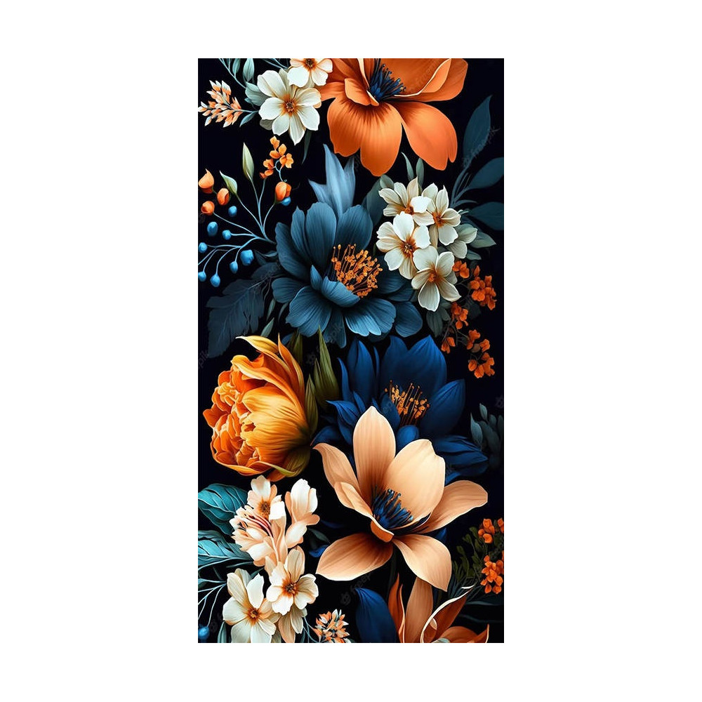 Toto diamantové malování oplývá vizuální symfonií barev, zobrazuje rozmanité květiny v široké paletě barev od hluboké modré přes zářivou oranžovou až po jemné bílé tóny.