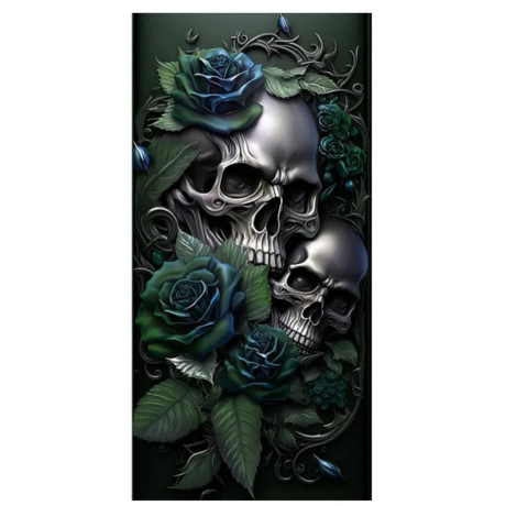Toto diamantové malování odhaluje kontrast mezi životem a smrtí skrze dvě lebky, které jsou jemně obklopeny temně zelenomodrými růžemi.
