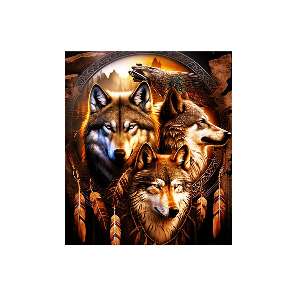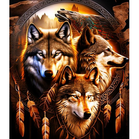 Toto diamantové malování přináší do vašeho domova silnou symboliku a krásu vlků, které jsou ve mnoha kulturách uctívány jako duchovní průvodci a symboly moudrosti a síly. V popředí jsou tři vlci, každý s vlastní jedinečnou barvou a vzorem, kteří vás svými pronikavými pohledy vtahují do hlubokého spojení s divokou přírodou. Aztécké vzory a peří dodávají obrazu historický kontext a uměleckou hloubku.