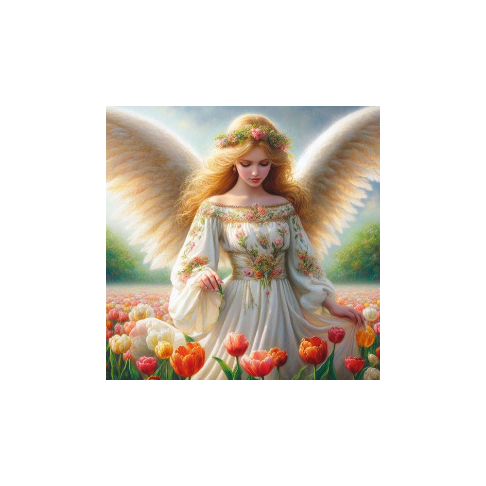 Představte si krásu jemné andělské postavy s nádhernými roztaženými křídly, jak se prochází mezi polem rozkvetlých tulipánů. Toto diamantové malování zachycuje pohled s výjimečným detailem, od zářivých barev květů až po smyslné obrysy andělské postavy. Anděl, symbol míru a čistoty, je obklopen přírodou a vyzařuje klid a harmonii. Kamínky dodávají obrazu lesk a rozmanitost, zatímco promyšlené umístění diamantů vytváří iluzi hladkosti a jemnosti tkaniny a křídel.