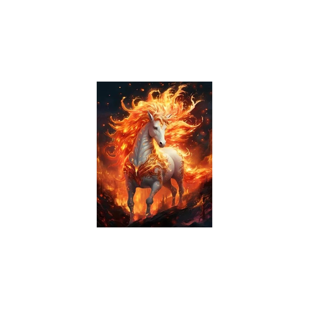 Tento ohnivý obraz diamantového malování je ztělesněním energie a vášně. Centrální postavou je majestátní hřebec, jehož hříva a ocas jsou ztvárněny jako živé plameny, táhnoucí se nad krajem zachváceným ohněm. Každý kousek plátna je rozžhavený barvami, od hlubokého rudého až po jasně zlatavou, s diamanty poskytujícími iluzi praskajících jisker.